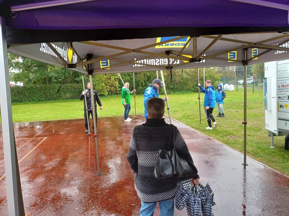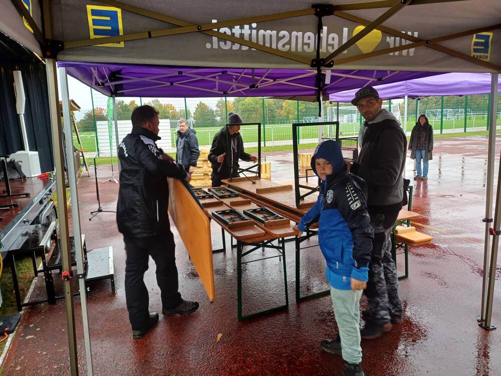 Der Aufbau der Zelte, Bänke, Grillstände und vieles mehr – unter anderem durch unseren Hauptsponsor Edeka Zeuch – war aufgrund des anhaltenden Regens alles andere als angenehm. Von morgens um 11 Uhr bis abends um 22 Uhr wurde gearbeitet – großes Lob an Max und sein Team! Gemeinsam mit den „Palmis“ klappte jedoch alles hervorragend – ein dickes Dankeschön auch an Olaf und seine Mannschaft.